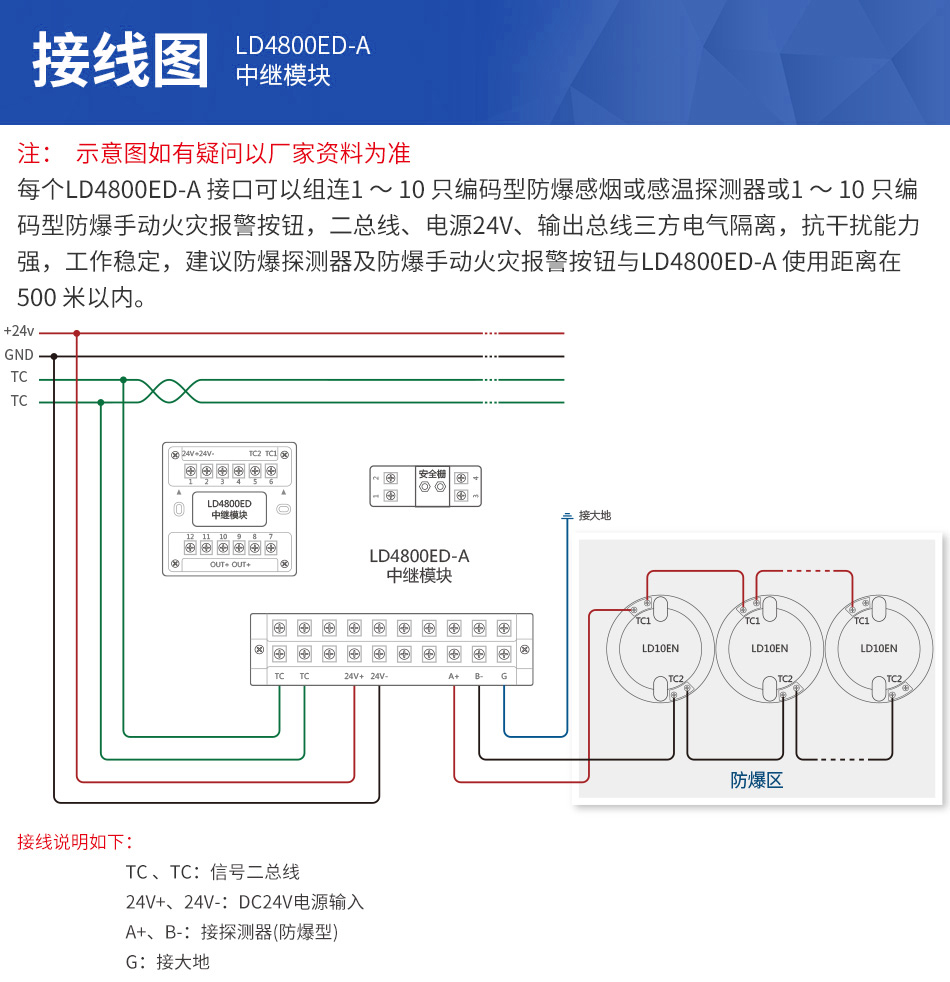 1、每個LD4800ED-A接口可以組連1~10只編碼型防爆感煙或感溫探測器或1~10只編碼型防爆手動火災(zāi)報警按鈕。