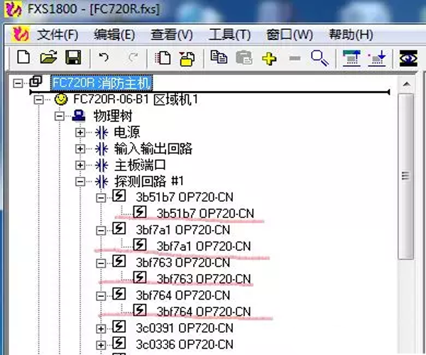 在調(diào)試軟件上看,每一個(gè)感煙探測(cè)器OP720下面都有一個(gè)通道,如圖