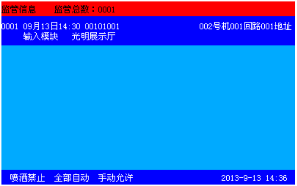 本控制器可在總線(xiàn)上連接輸入模塊,可通過(guò)總線(xiàn)部件設(shè)置成監(jiān)管模式。當(dāng)發(fā)生監(jiān)管報(bào)警后控制器將進(jìn)入監(jiān)管報(bào)警信息顯示(如圖3-5所示),同時(shí)監(jiān)管指示燈常亮。