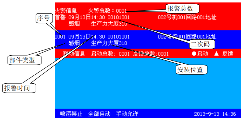 控制器經(jīng)確認(rèn)后進(jìn)入火災(zāi)報(bào)警狀態(tài)并發(fā)出火警聲、光警報(bào)。此時(shí)面板上紅色火警指示燈常亮,液晶屏上顯示火警序號(hào)、火警總數(shù)、首警部位、報(bào)警部件的編碼及類(lèi)型、報(bào)警時(shí)間、安裝位置等信息(詳見(jiàn)圖上半屏顯示),同時(shí)打印機(jī)、歷史記錄記錄相關(guān)火警信息。當(dāng)火警數(shù)量超過(guò)兩條顯示時(shí),除首警外,其余報(bào)警可自動(dòng)循環(huán)顯示,按鍵盤(pán)上的“▲”、“▼”鍵也可手動(dòng)查詢(xún)。