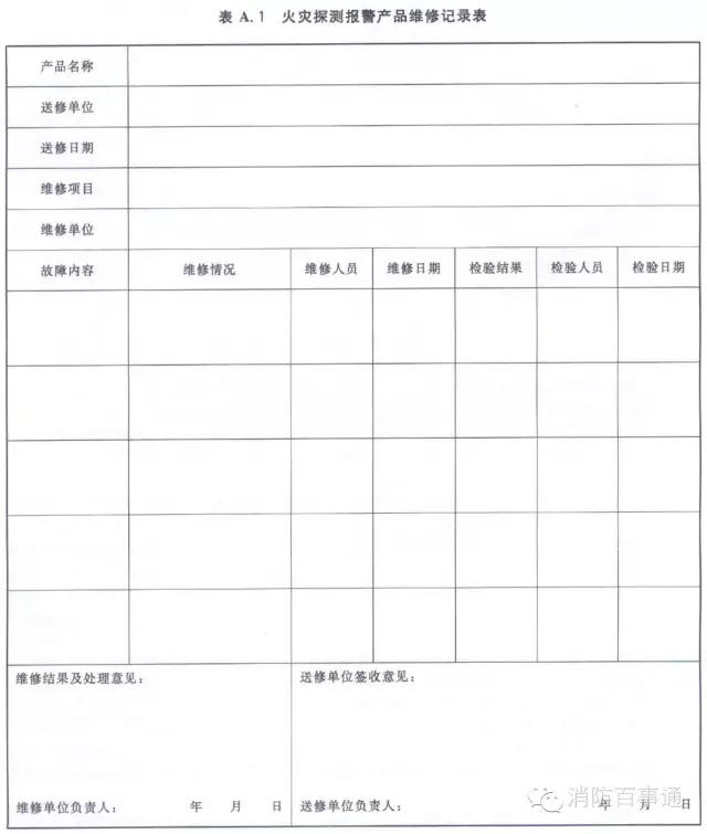 3.1.6承擔維修的企業應做好維修記錄,與產品使用或管理單位各執一份,并保存至該產品報廢?;馂奶綔y報警產品維修記錄表的格式參見附錄A。