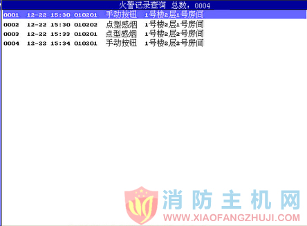 1.2.3 火警記錄查詢  進入“2、火警記錄查詢”,可檢查火警記錄信息,如圖1-6所示。每條信息包括序號、火警發生的時間、二次碼、設備類型及注釋信息。本控制器可查詢系統新發生的1000條火警記錄信息